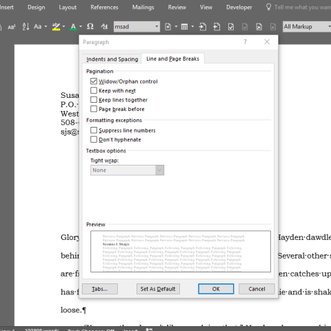 If you’ve got one of the ribbon versions of Word, it’s on the Home ribbon. Click the little arrow in the lower-right corner of the Paragraph block, then click the Line and Page Breaks tab. Voilà!