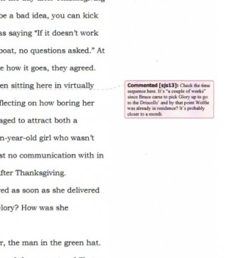 Hell, I even query myself. A lot. Every draft of my every manuscript has got queries in it: comments from members of my writers’ group, thoughts that have occurred to me while writing, rereading, or walking with the dog. Mostly I’m pretty tactful in those queries to myself, but sometimes you can tell I’m getting exasperated.