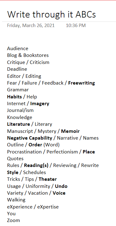 On the brink of April, with the Blogging A to Z Challenge in mind, I had started an A-to-Z list in Onelook. At first there were several blank lines, but they filled in pretty quickly so by mid-month it looked like the screenshot at left. The options I actually decided to blog about are in bold.